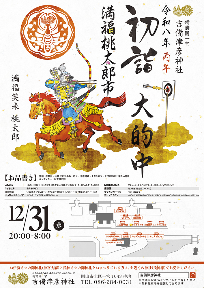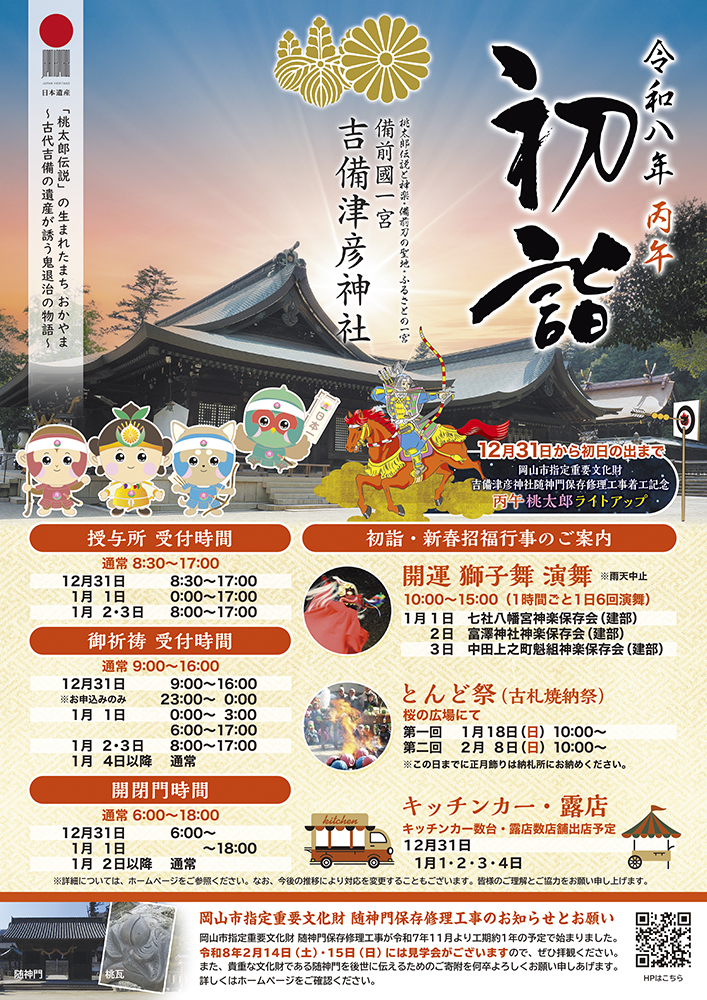 特にこの度は、めでたく岡山市指定重要文化財 吉備津彦神社随神門保存修理工事が始まり、着工奉祝記念の「丙午桃太郎ライトアップ」を令和7年12月31日日暮れより初日の出まで行っております。