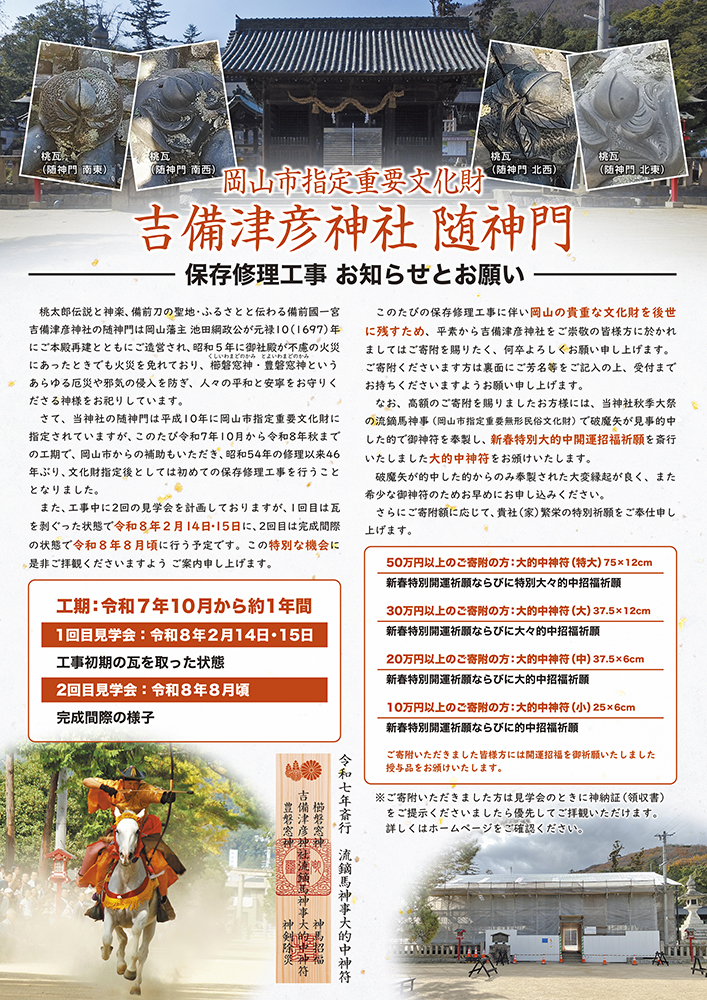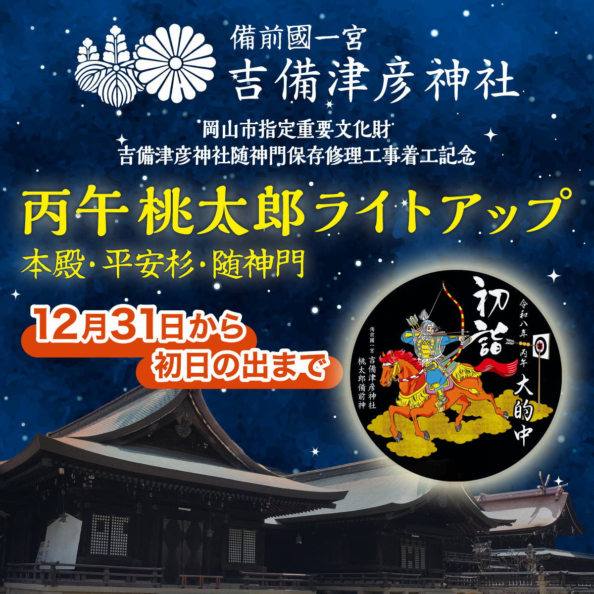 特にこの度は、めでたく岡山市指定重要文化財 吉備津彦神社随神門保存修理工事が始まり、着工奉祝記念の「丙午桃太郎ライトアップ」を令和7年12月31日日暮れより初日の出まで行っております。